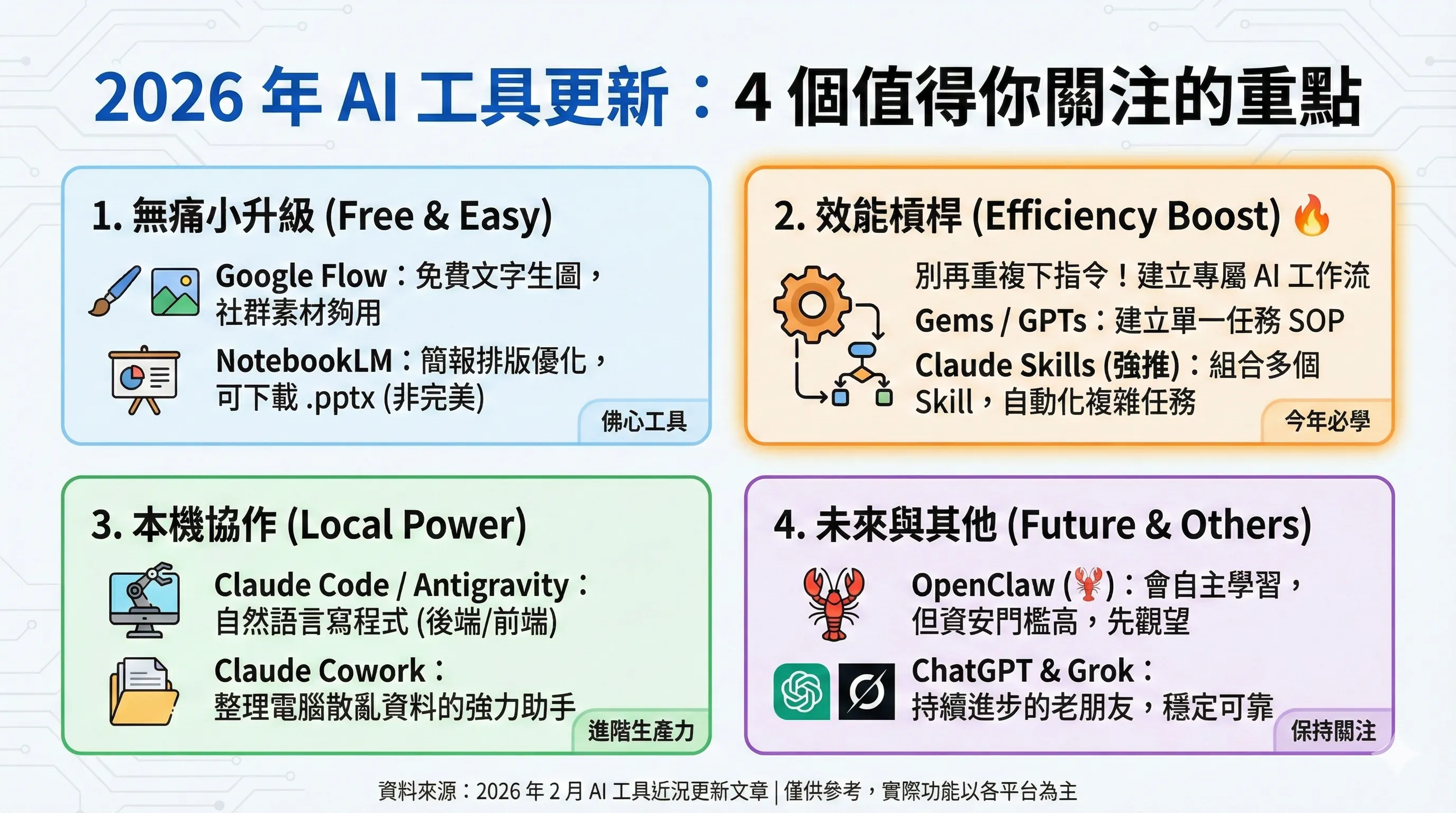 2026 年 AI 不只是聊天,而是能出簡報、組工作流、進你電腦整理檔案。整理 NotebookLM、Flow、Gemini Gems、Claude Skills、OpenClaw 等工具的最新更新與實測心得,從無痛入門到進階應用,幫你找到適合自己的 AI 升級路徑。