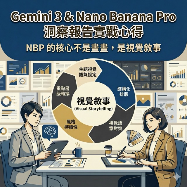 一週使用 Gemini 3 與 Nano Banana Pro 產出 25 份洞察報告後,我深刻理解 AI 與數據分析師的分工差異:AI 擅長視覺敘事、邏輯架構與摘要,但仍無法理解因果關係、噪音清理與商業判讀。這篇是最真實的實測心得。
