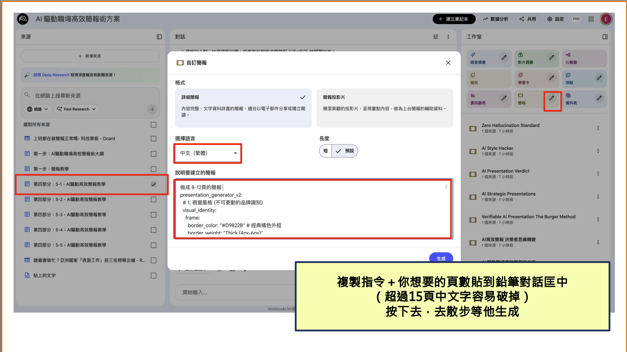 NotebookLM 適合生簡報,因為它的 RAG 特質,會完全根據你提供的素材進行邏輯梳理與整理,不像 Gemini/GPT 等大語言模型會忍不住想要幫你來點創意(但生簡報階段不需要啊。