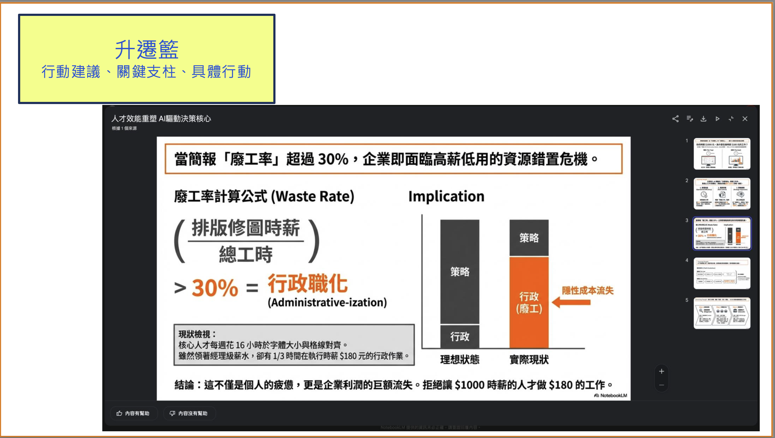 「升遷籃」:追求「勝」。這是最重要的場合,如年度策略報告,應利用 AI 進行深度對話與輔助邏輯架構。