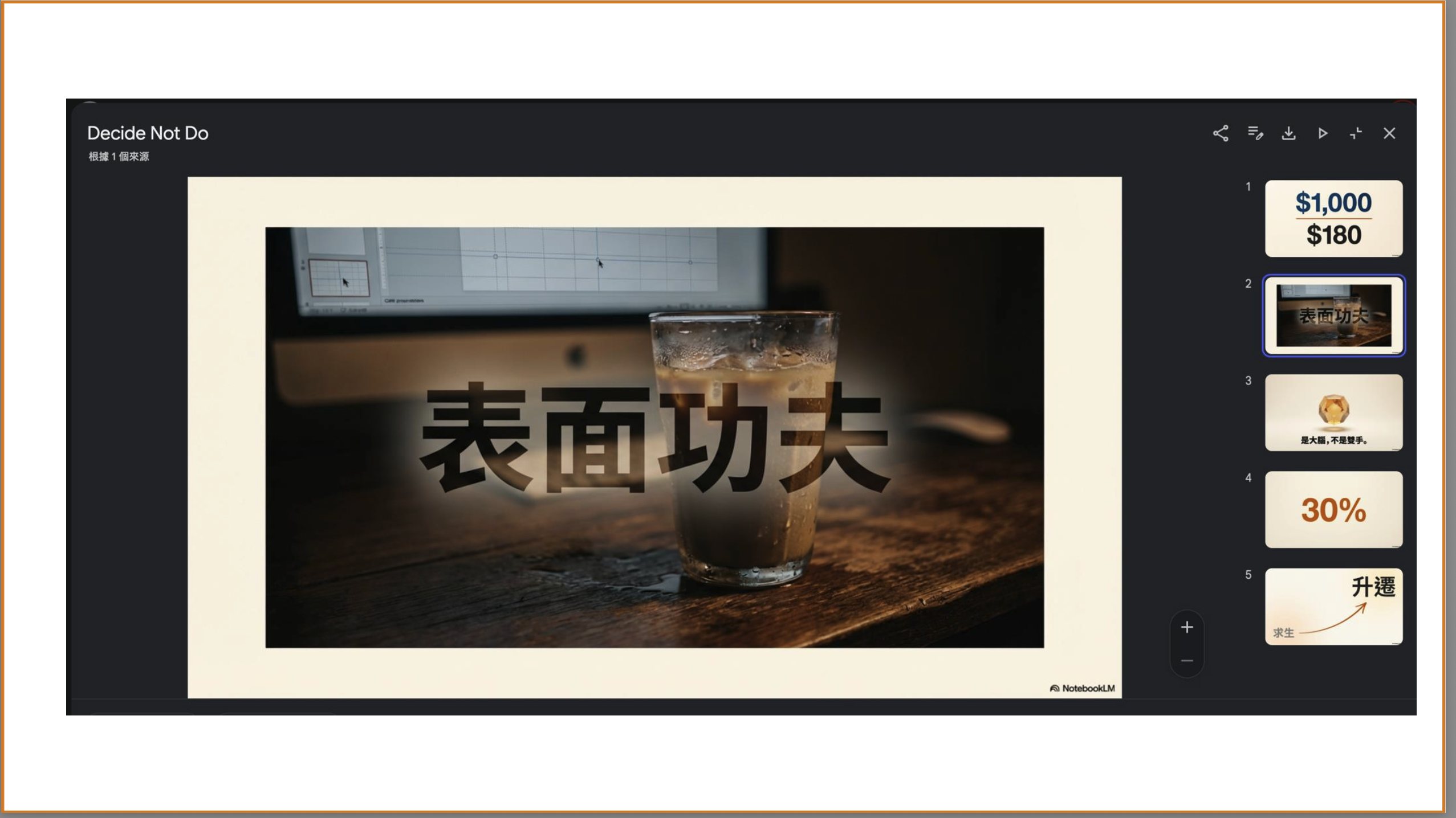 這中間的差別,基本上就是「你是在外包簡報給 AI 工讀生」vs「你在叫 AI 複製你自己」。重點是,這種簡報是你可以改得動,也不會讓人家懷疑是 AI 做的。