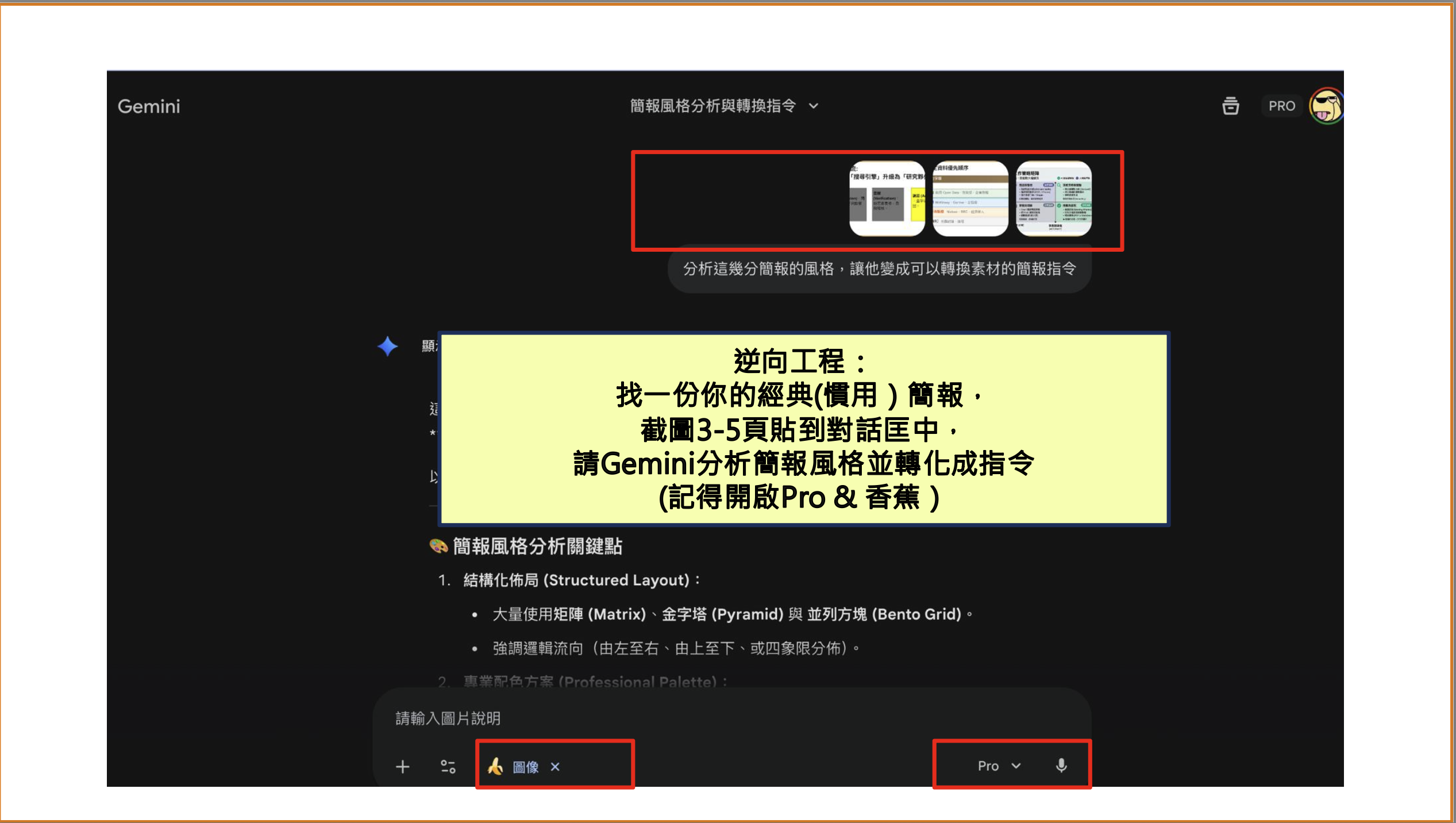 我會先丟 3–5 張既有的範例簡報截圖給 Gemini(通常是公司內部的、或我自己很確定「這就是我改得動的那種」)。會用這句指令請它開工:「分析這幾張簡報,變成可以轉換內容素材的簡報指令」,它就會開始幫你分析結構:
