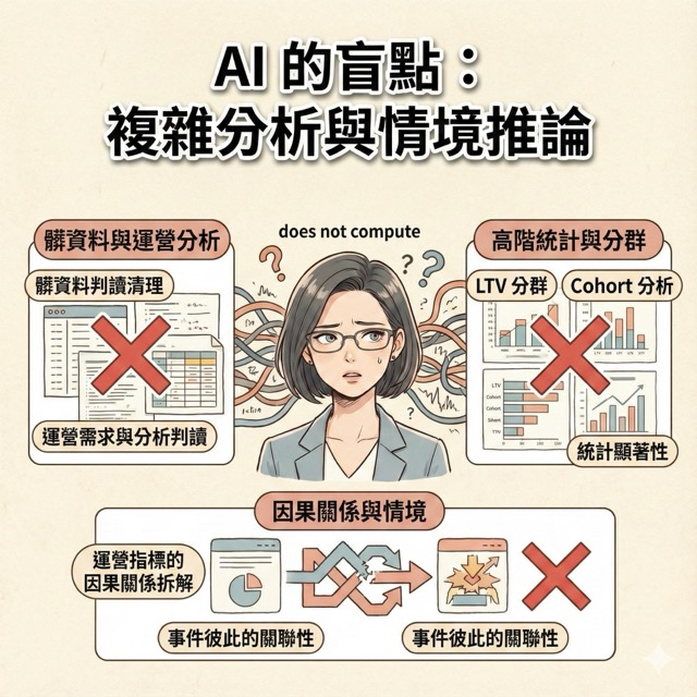 它還做不到:髒資料判讀清理/運營需求與分析判讀/ KPI drill-down/cohort/retention curve/LTV 分群/funnel 收斂率/兩組對照時的統計顯著性/segment 差異判讀/ RFM分群/ 運營指標的「因果關係拆解」。