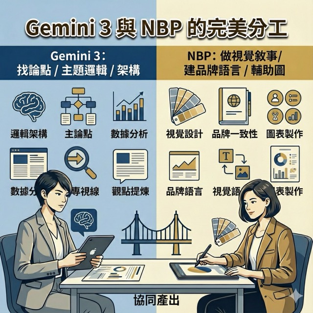 Gemini = 論點、架構、邏輯 ;NBP = 做視覺、風格、理解輔助圖