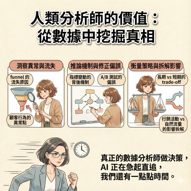 但真正影響商業結果的,是:顧客行為的異常點/funnel 的流失原因/指標變動的背後機制/事件彼此的關聯性/長期 vs 短期的 trade-off/A/B 測試的偏誤/行銷活動 vs 自然流量的影響拆解