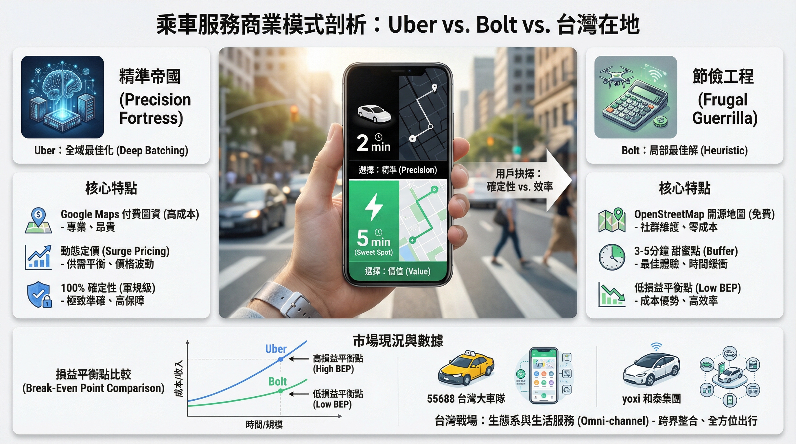 我試著剖析Bolt作為叫車市場的「第三物種」,如何用低成本演算法挑戰Uber昂貴的「混合圖資堡壘」,以及這種模式在台灣這個靠「生態圈」而非「車資」獲利的特殊市場中,究竟有多少生存空間。