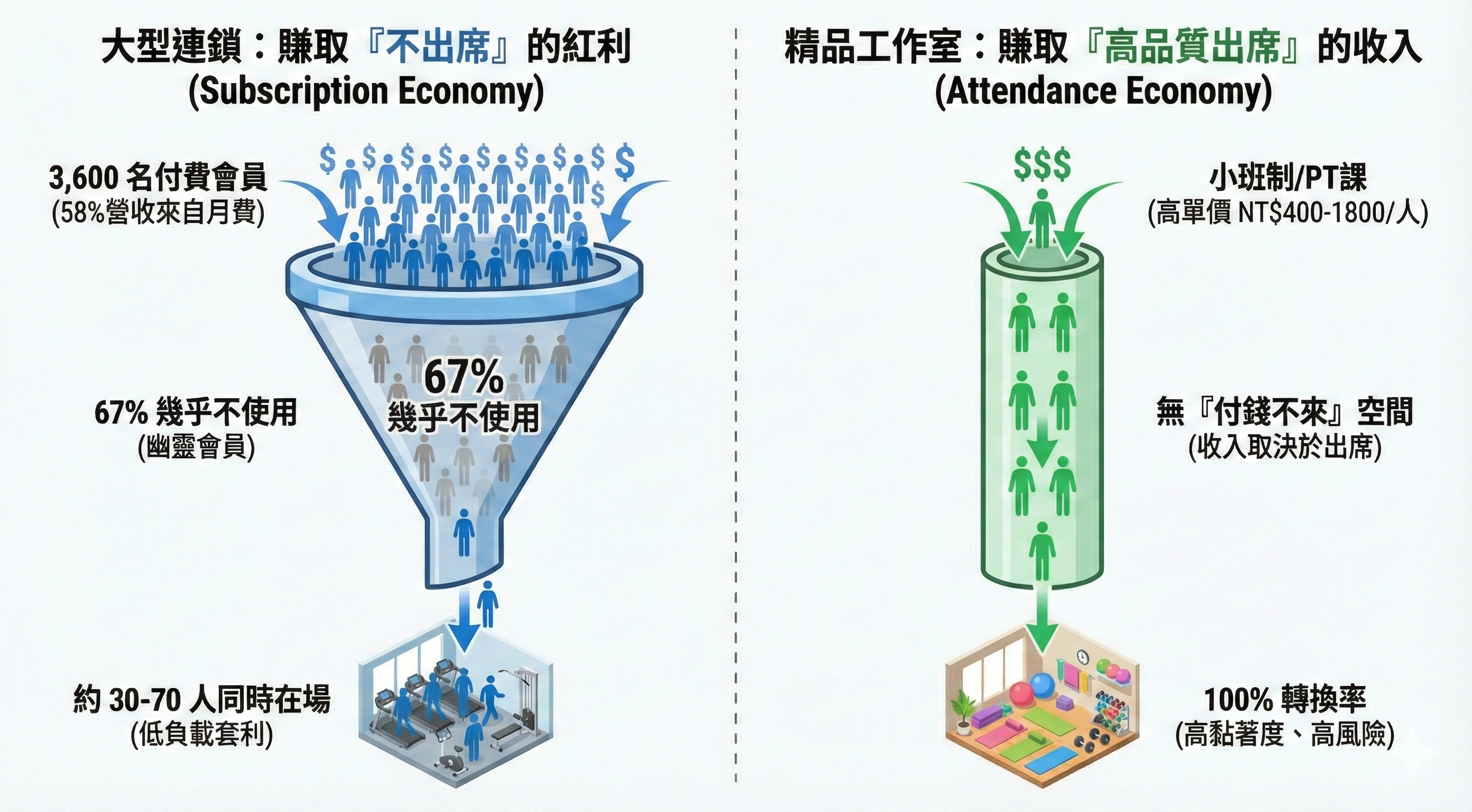 小型精品工作室反過來。一堂小團課 6 到 12 人,每人收 NT$400-600。收入完全取決於有多少人真的走進來上課。沒有人「付錢不來」的空間可以套利。