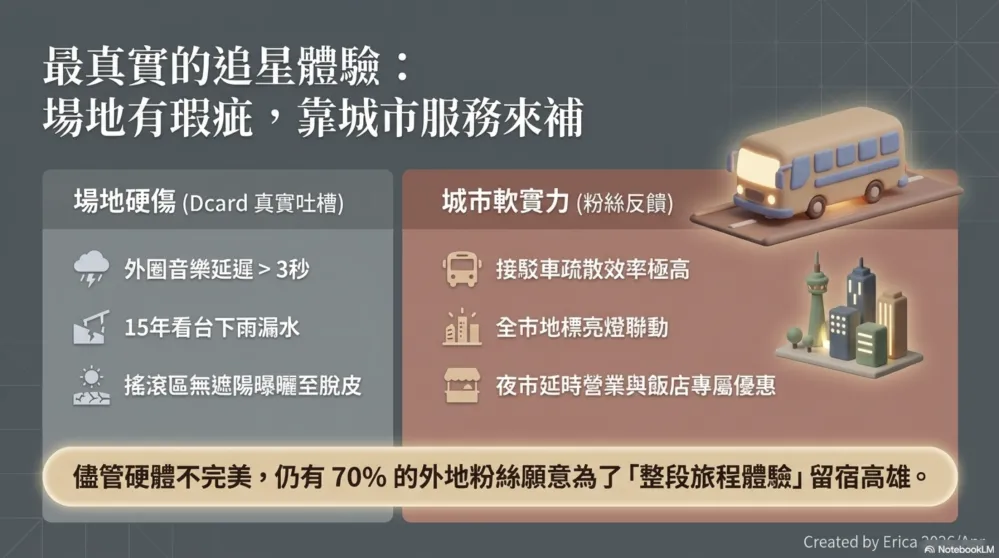 這就是高雄演唱會經濟最真實的樣子:場地有瑕疵,但整座城市的服務態度把不足補回來了。