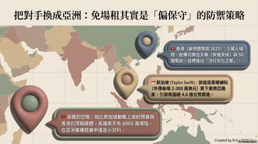 在亞洲場地戰的角度,免場租是性價比極高的防禦性策略,跟新加坡和泰國比起來甚至偏保守。香港啟德已經啟用,配備更好的設施和天幕,這會是高雄接下來最大的對手。