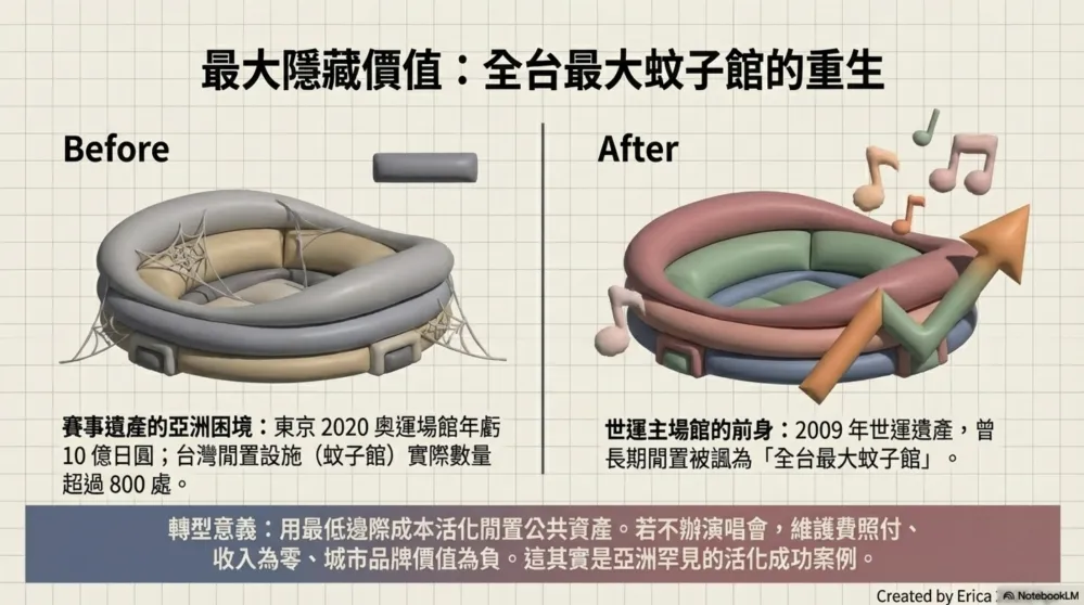 高雄世運主場館是 2009 年世界運動會的遺產。賽後長期閒置,行政院持續補助營運費,場館基本空著。當時它有一個稱號:全台最大蚊子館。
