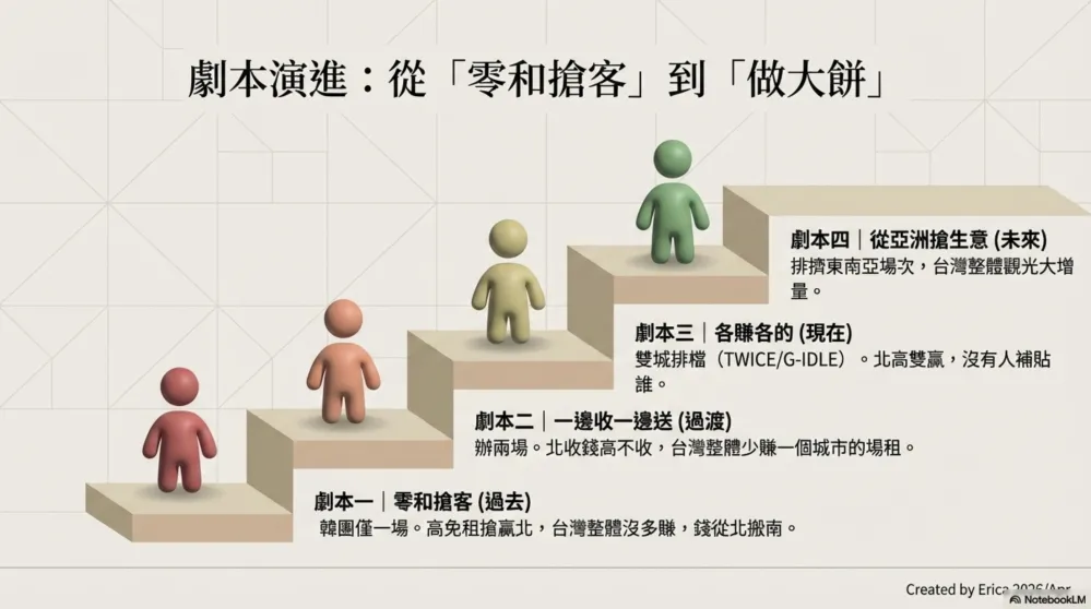 劇本一:零和搶客。 韓團來台灣只辦一場,高雄用免場租搶贏台北。高雄少了場租、贏了周邊消費,但台灣整體沒多賺——只是把錢從北搬到南。
