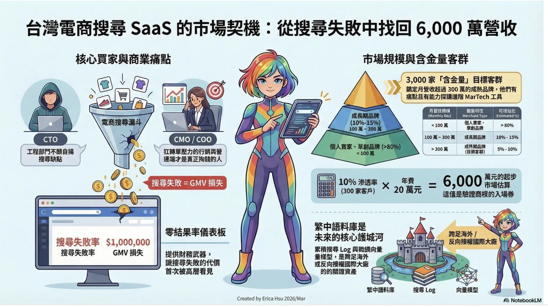 假設台灣符合此規模的品牌約有 3,000 家,若能透過「零結果率儀表板」讓客戶看見隱性損失,並以 10% 的合理初期滲透率計算(約 300 家客戶),收取每年 20 萬元的 SaaS 訂閱費,這會是一個年營收 6,000 萬元的起步市場。