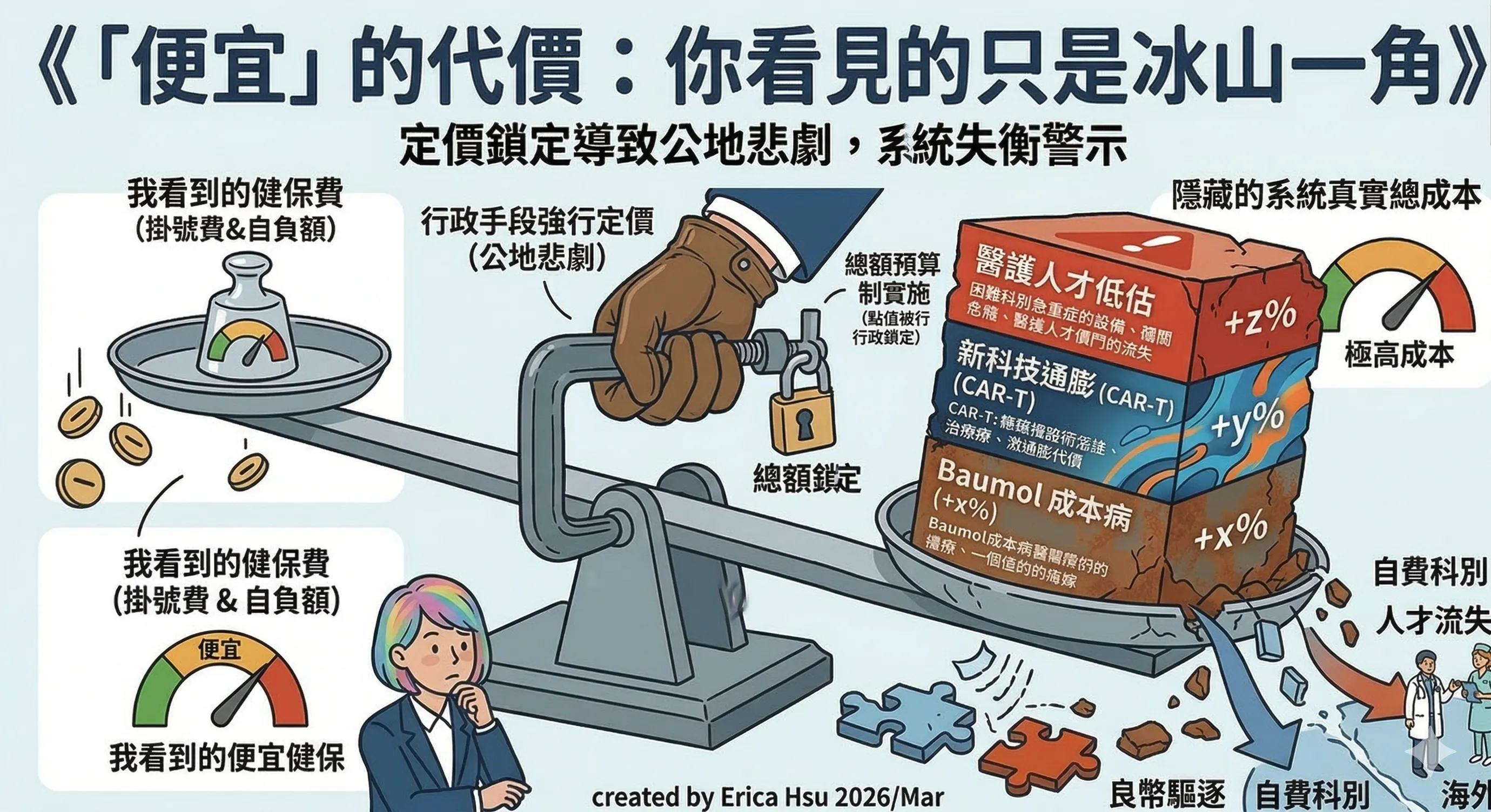 2026年 | 三個後果的現在進行式 良幣驅逐(護理師執業率僅六成、急重症缺人)、帳單轉嫁家庭(最低所得長輩的積蓄緩衝越來越薄)、系統裂成健保與自費兩個世界。