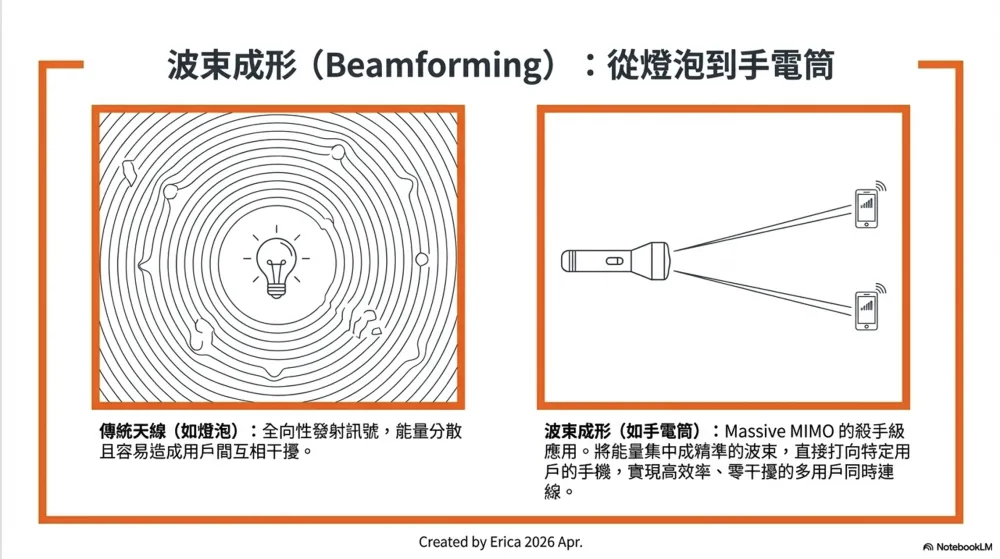 波束成形(Beamforming) 是 Massive MIMO 的殺手級能力:傳統天線像燈泡,向所有方向發光(浪費能量);波束成形像手電筒,把能量精準打向特定用戶。這讓 5G 基站能同時服務更多用戶而不互相干擾。