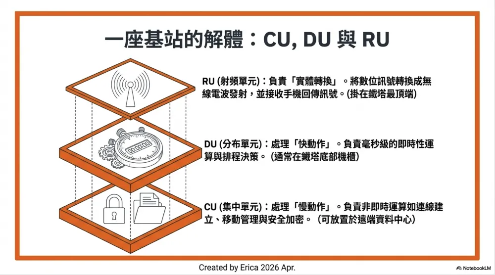 | RU(Radio Unit) | 把數位訊號轉成無線電波發射,接收手機回傳的電波 | 掛在鐵塔或建築頂端,靠近天線 |