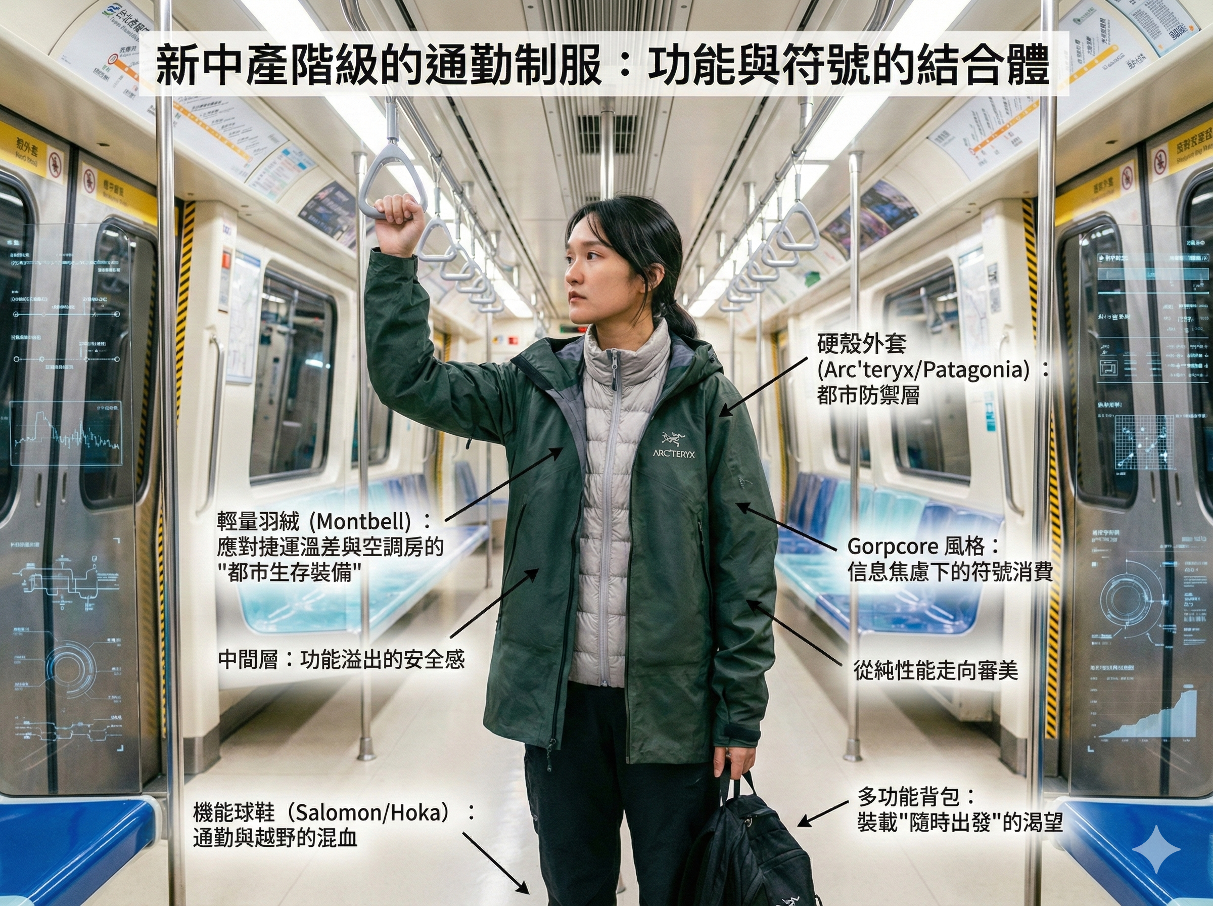符號重塑:蔡國強的煙火秀告訴消費者,這不再是去泥地打滾的工具,而是中產階級的「安全感圖騰」。對於坐在冷氣房寫 Code 的工程師來說,穿上一件三萬元的始祖鳥,是一種昂貴的心理安慰劑:「雖然我被困在辦公室,但我擁有隨時逃離都市、在末日生存的能力。」