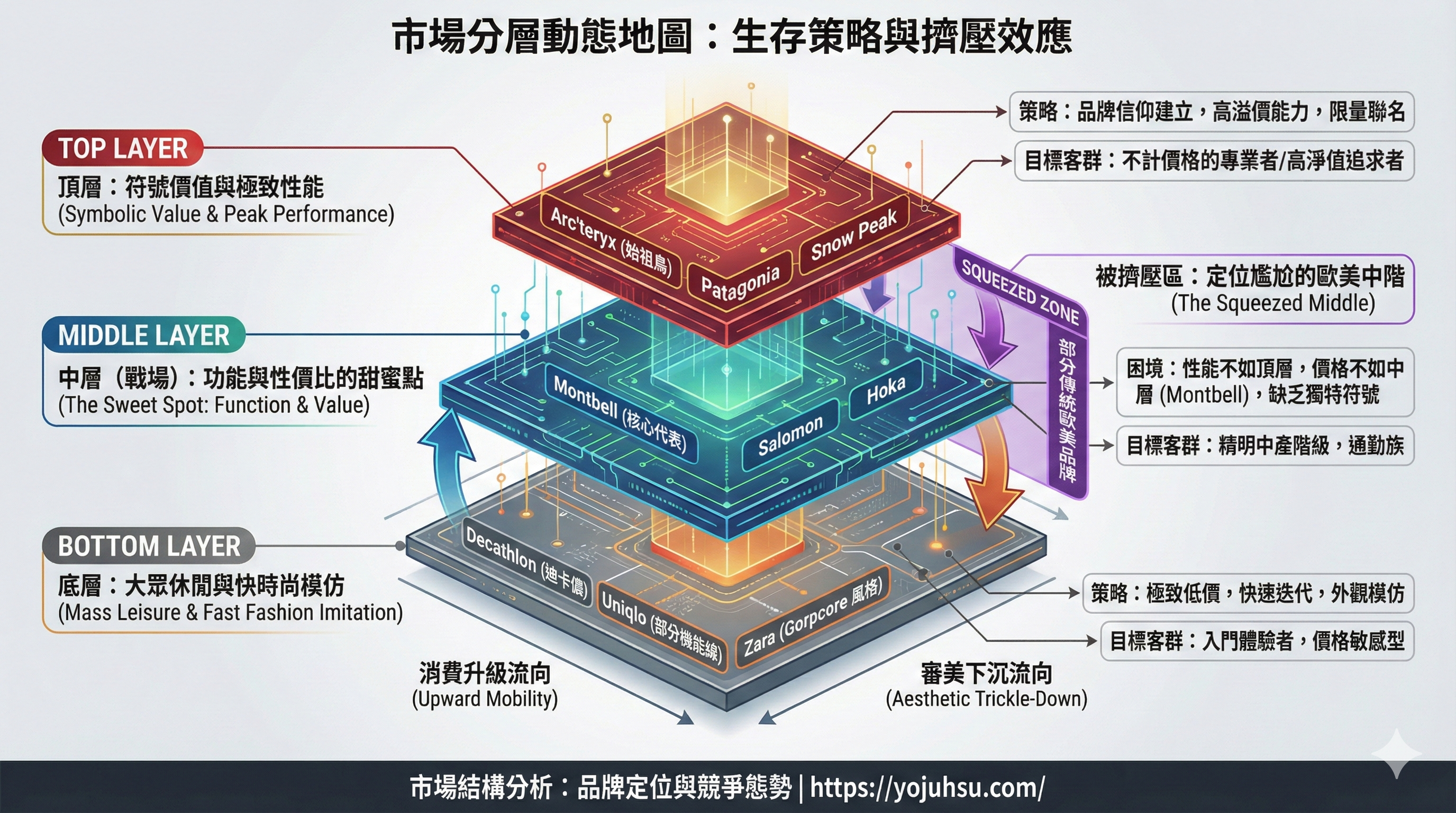 特徵:毛利最高 (70%+),技術壁壘最強。這是 Arc'teryx 與 The North Face 的絕對統治區。