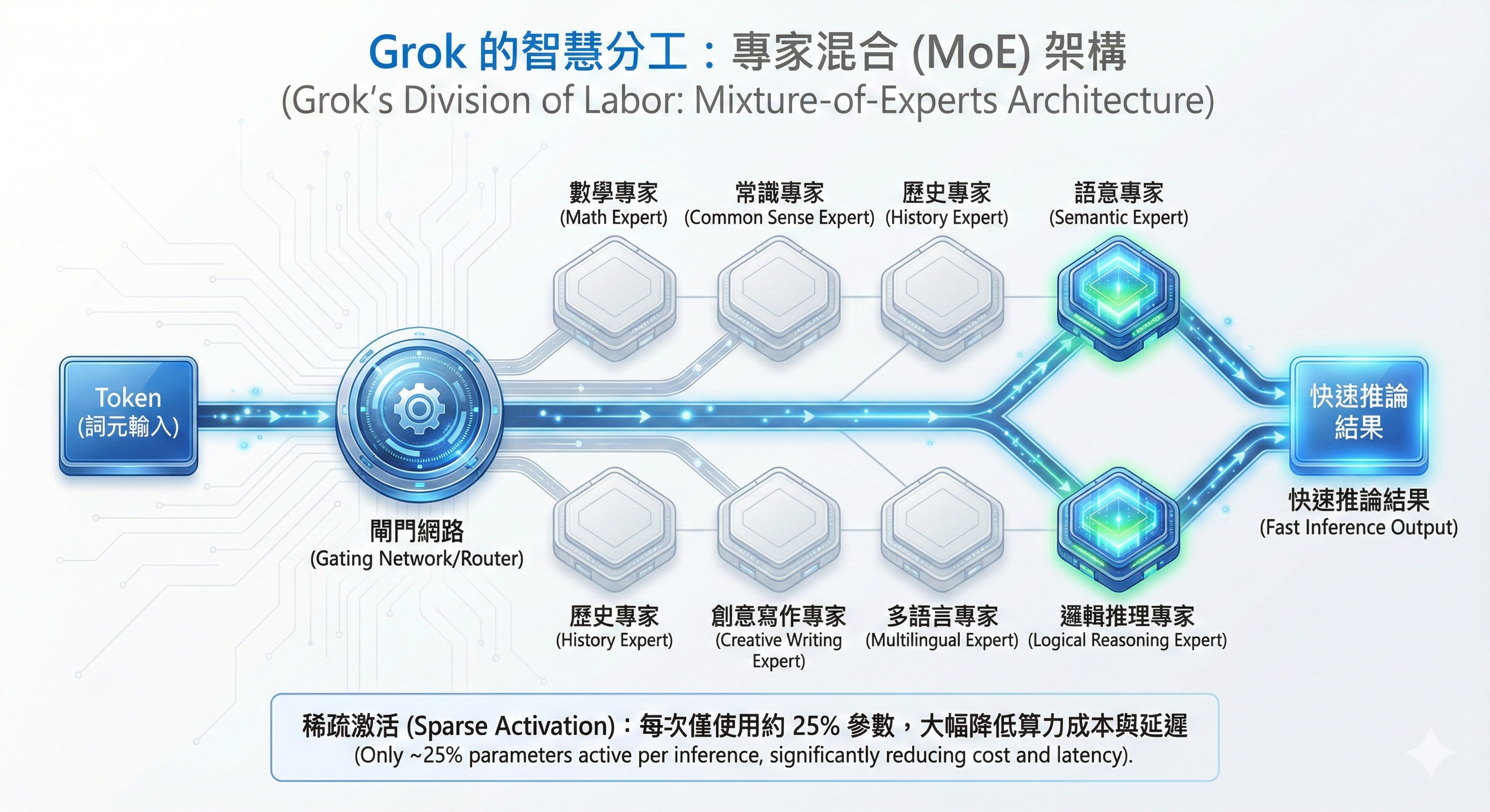 當輸入一個 token(詞元)時,一個「閘門網路」(gating network 或 router)會根據輸入特徵動態決定激活哪幾個專家(Grok-1 中為 2 個專家),僅激活約 25% 的參數(有效活躍參數約 78.5 億)。這叫做稀疏激活(sparse activation)。