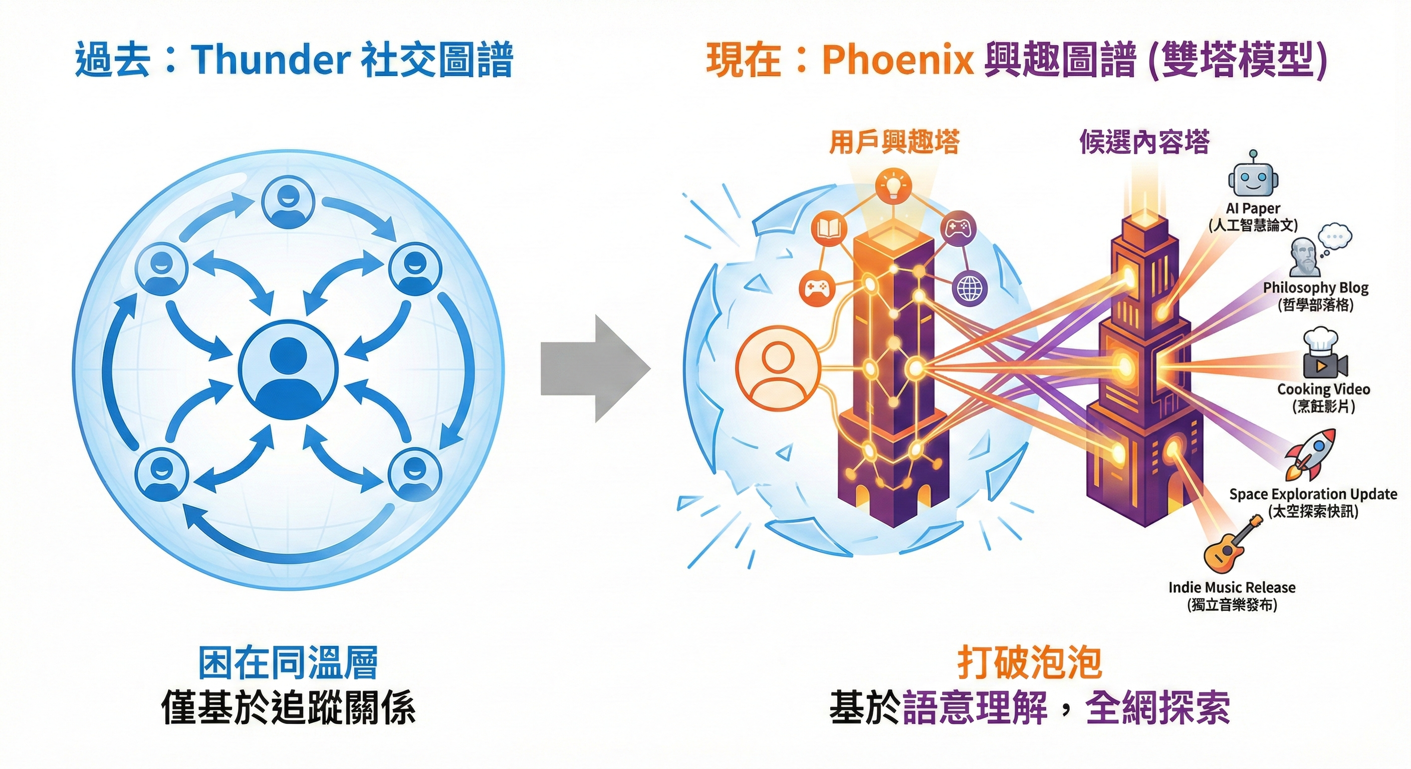 過去的 Thunder 模組,主要依賴社交圖譜,強調追蹤關係和已知圈子的內容。這是傳統推薦的遺產,計算延遲極低(sub-millisecond 級),但容易導致用戶困在「社交泡泡」中,缺乏新鮮發現。在 2023 年的舊版開源中,Thunder 仍是核心,但如今它被定位為輔助角色。